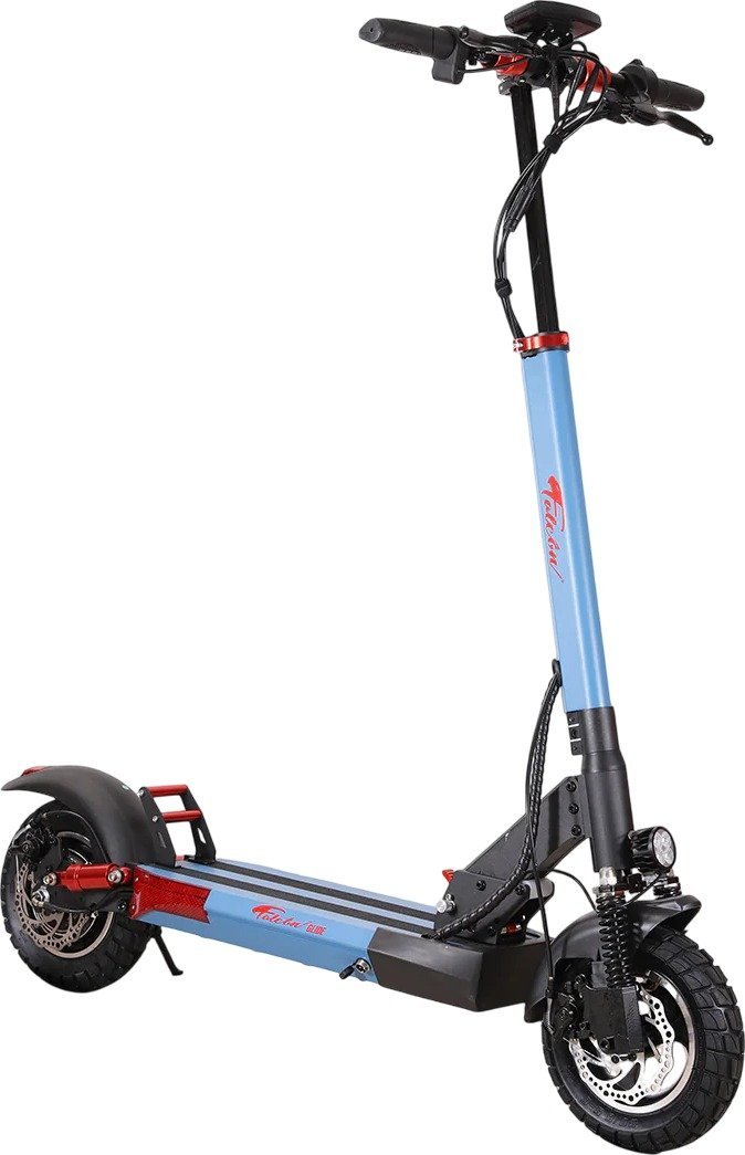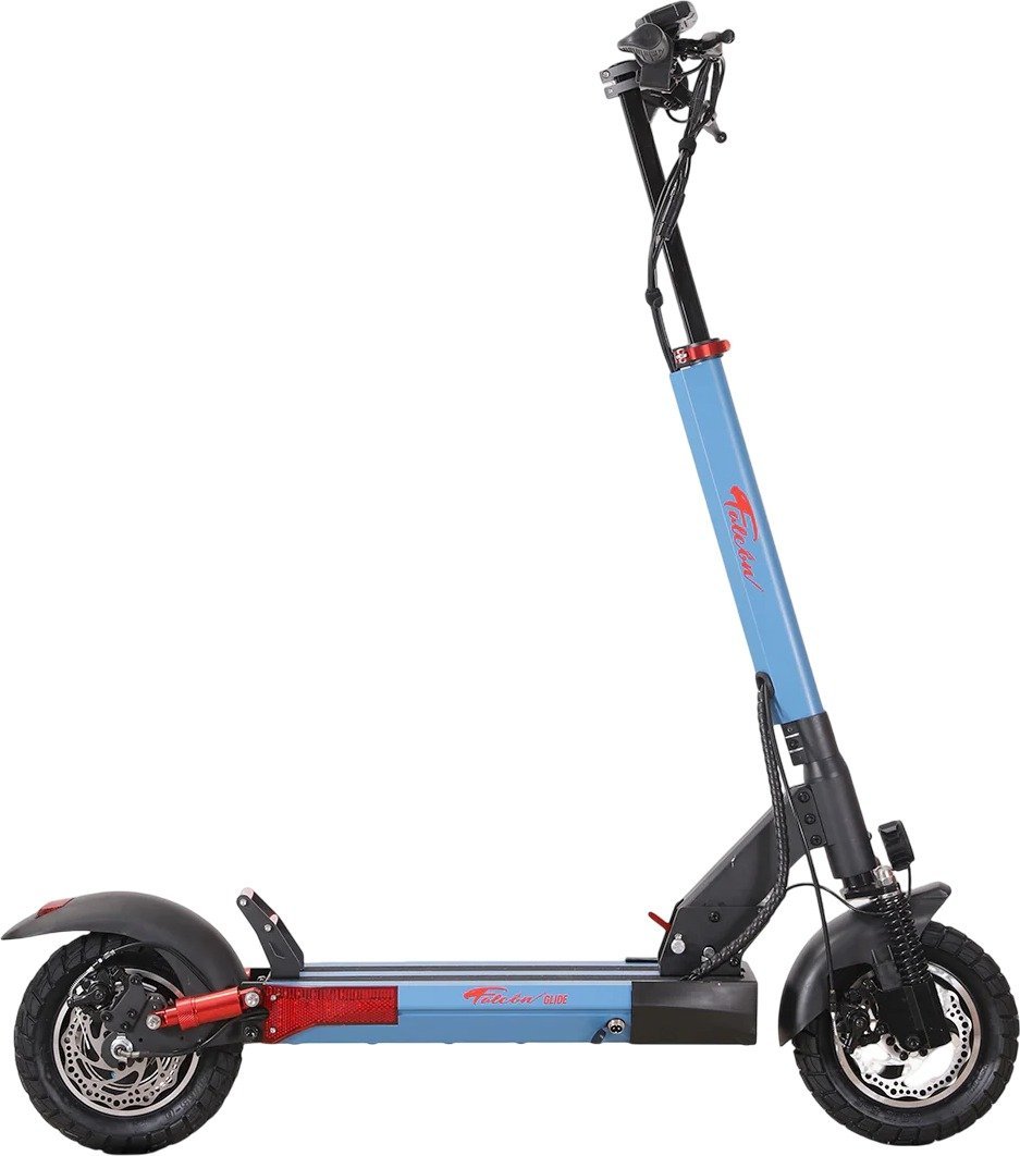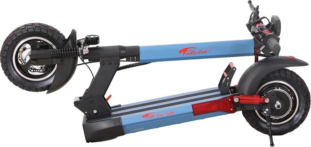 FALCON GLIDE – סוללה 48V/13Ah, טווח עד 40 ק״מ, שיכוך קדמי ואחורי, בלמים מכניים, גלגלי מגנזיום ‎10×3‎ אינץ׳, תאורת LED עם איתותים, מערכת קיפול קלה, צבע כחול, משקל קל 20 ק״ג.